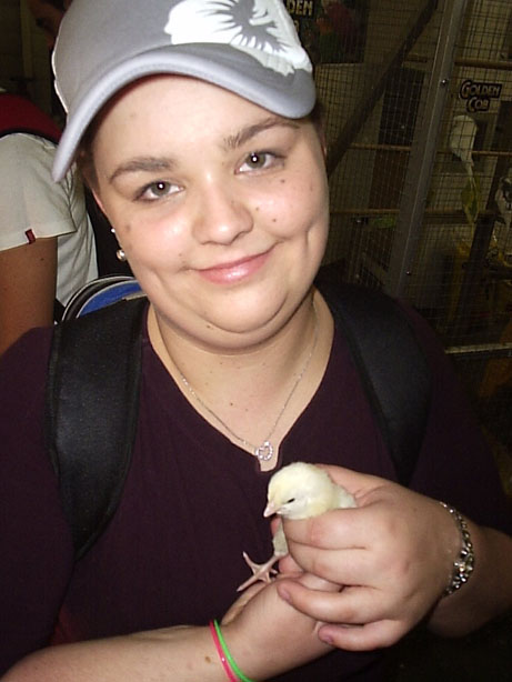 Courtney and a baby chicken. She's snapping its little neck... sicko.