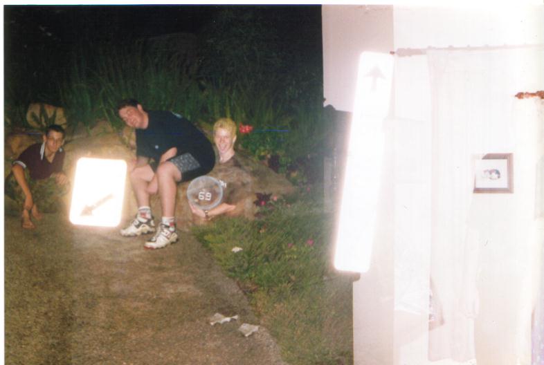 3 pics superimposed this time but lets just keep to whats on the left. First a picture outside Yongas house: Ben and I holding the keep left sign where we dumped it on his drive way. 2nd Peter carrying a "69" Letter box, yes the WHOLE letter box.