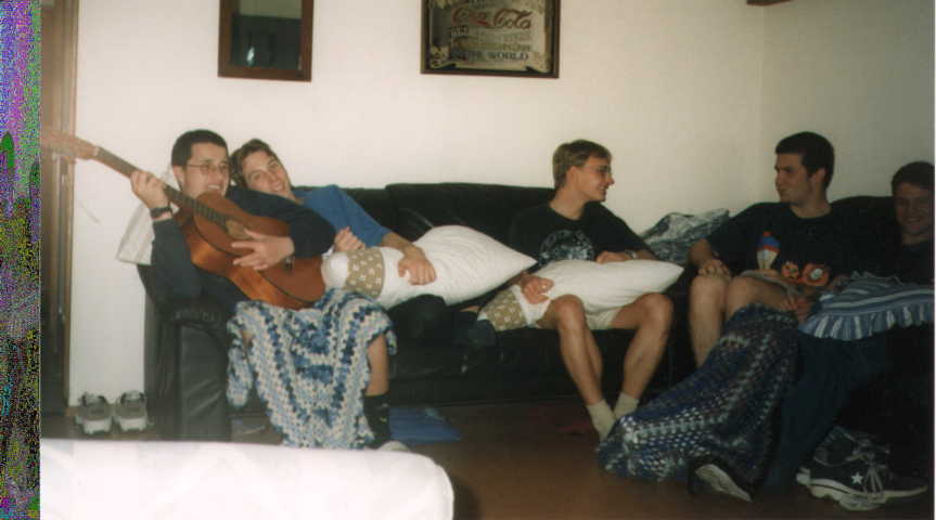 From left to right: Yongas showing us all his musical talent on my broken, untuned, and pretty much stringless guitar. Michael M being his usual whacked out self. Sven the departed Swedish guy (not dead just departed) being freaked out by the next two people. Stuart and Peter C pretending they too are god. And finally Jacqui the poor girl caught up in the shemozzle this night turned out to be.