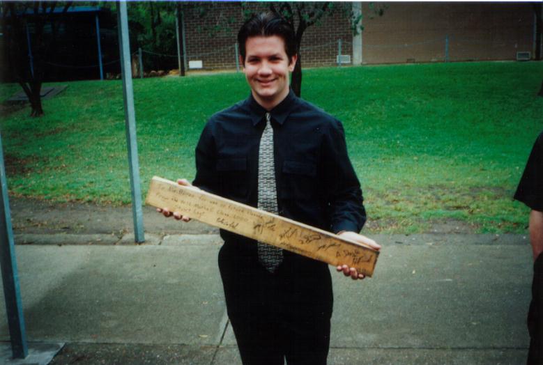 Stuey with the piece of 4 by 2, signed by the Maths C class.