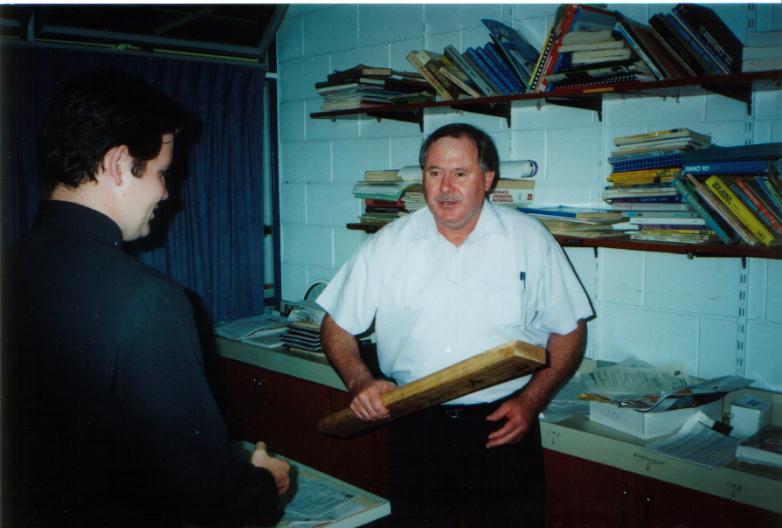 Stuart presenting the piece of 4 by 2 to Mr Burzar, my Maths C teacher.