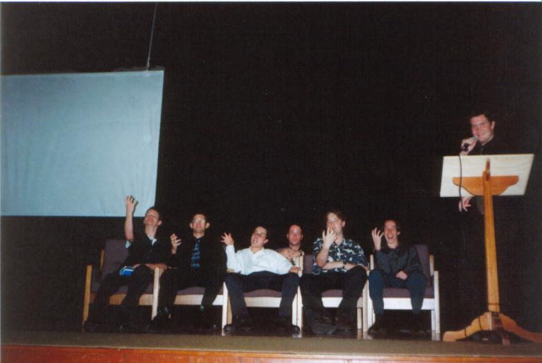 Us on the Hall stage/ (L to R): Peter, Jason, Yongas, Joel, Me, Rohan, and Stuart on the microphone.
